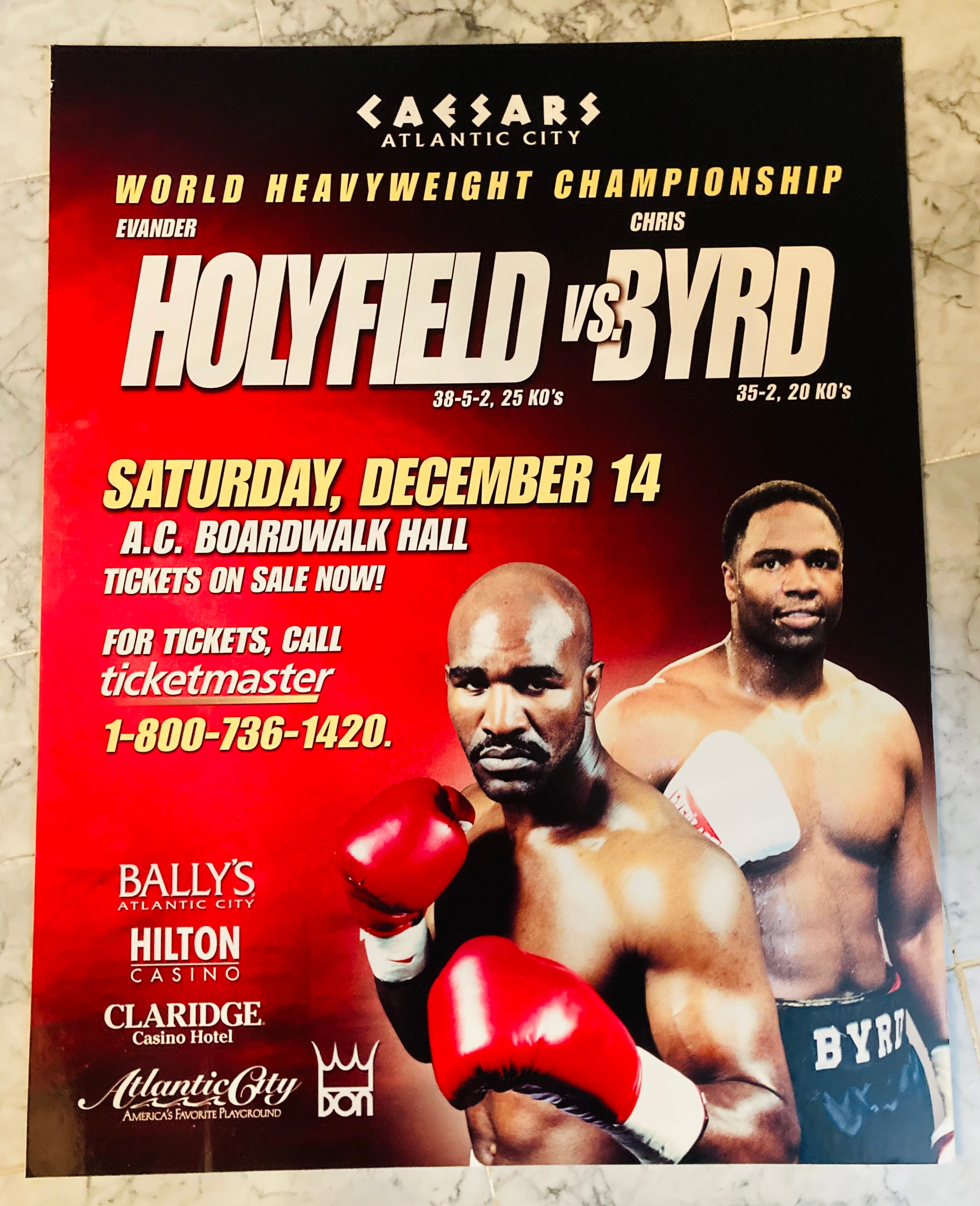 Soon after Lennox Lewis knocked out Mike Tyson to retain the unified heavyweight title, he vacated the IBF belt. That paved the way for then-40-year-old Evander Holyfield, seeking to become a five-time heavyweight titleholder, to face Chris Byrd for the vacant belt in an HBO main event at Boardwalk Hall in Atlantic City. As always, Holyfield gave it all he had but he simply could not deal with the faster southpaw Byrd’s movement and defense. Byrd, who dispensed with his usual hit-and-run style in the late rounds in favor of standing in and trading with Holyfield, won a unanimous decision, 117-111, 117-111, 116-112, to claim the belt and make him a two-time heavyweight titlist. I was ringside to cover the fight for USA Today on Dec. 14, 2002 — 19 years ago on Tuesday. Here is an ultra rare cardboard site poster from the fight that was on display at Caesars Atlantic City during fight week.