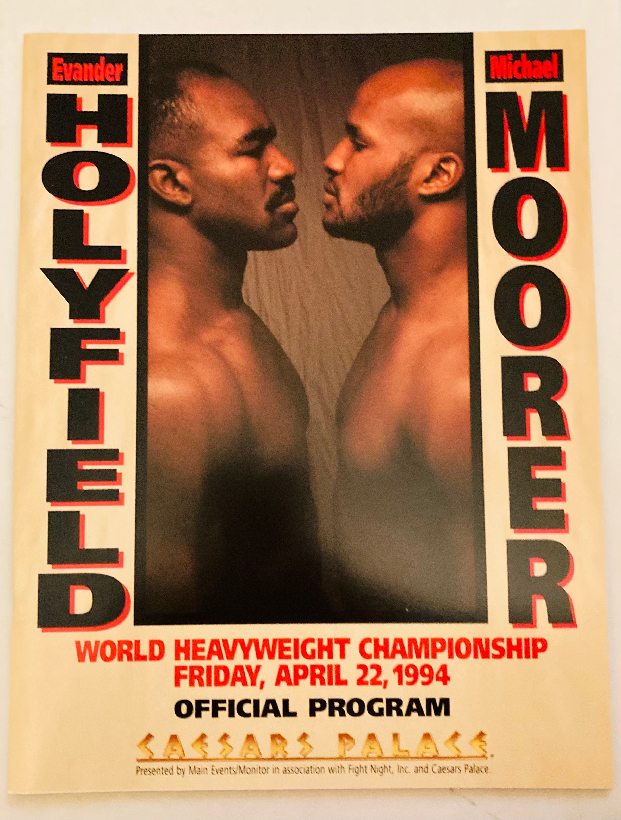 After the fight, Holyfield was hospitalized with various issues — dehydration, a rotator cuff injury and a heart ailment, all of which somewhat overshadowed Moorer’s achievement of scoring the upset and becoming the first left-handed heavyweight champion. The fight was on April 22, 1994 — 28 years ago on Friday. Here is a program from the fight in my collection.