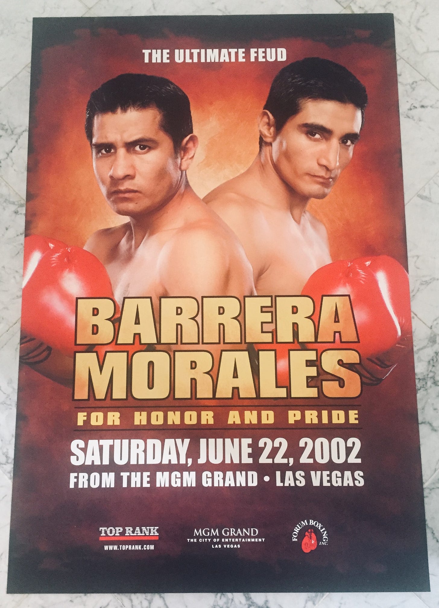 The fight, which had been delayed for three months because Barrera suffered a rib injury in training, was the least exciting of the trilogy but still a worthy fight between legends. Whereas Morales got the disputed decision in the first fight, Barrera won a heavily debated decision in the sequel, 116-112, 115-113 and 115-113, but declined to accept the WBC featherweight title he had won, so it became vacant. The rematch took place on June 22, 2002 — 20 years ago on Wednesday. Here are two posters from the fight in my collection: the site poster that could be purchased during fight week and on fight night at the MGM Grand as well as an extraordinarily rare site duratran advertising the fight that hung in an MGM Grand light box during fight week.