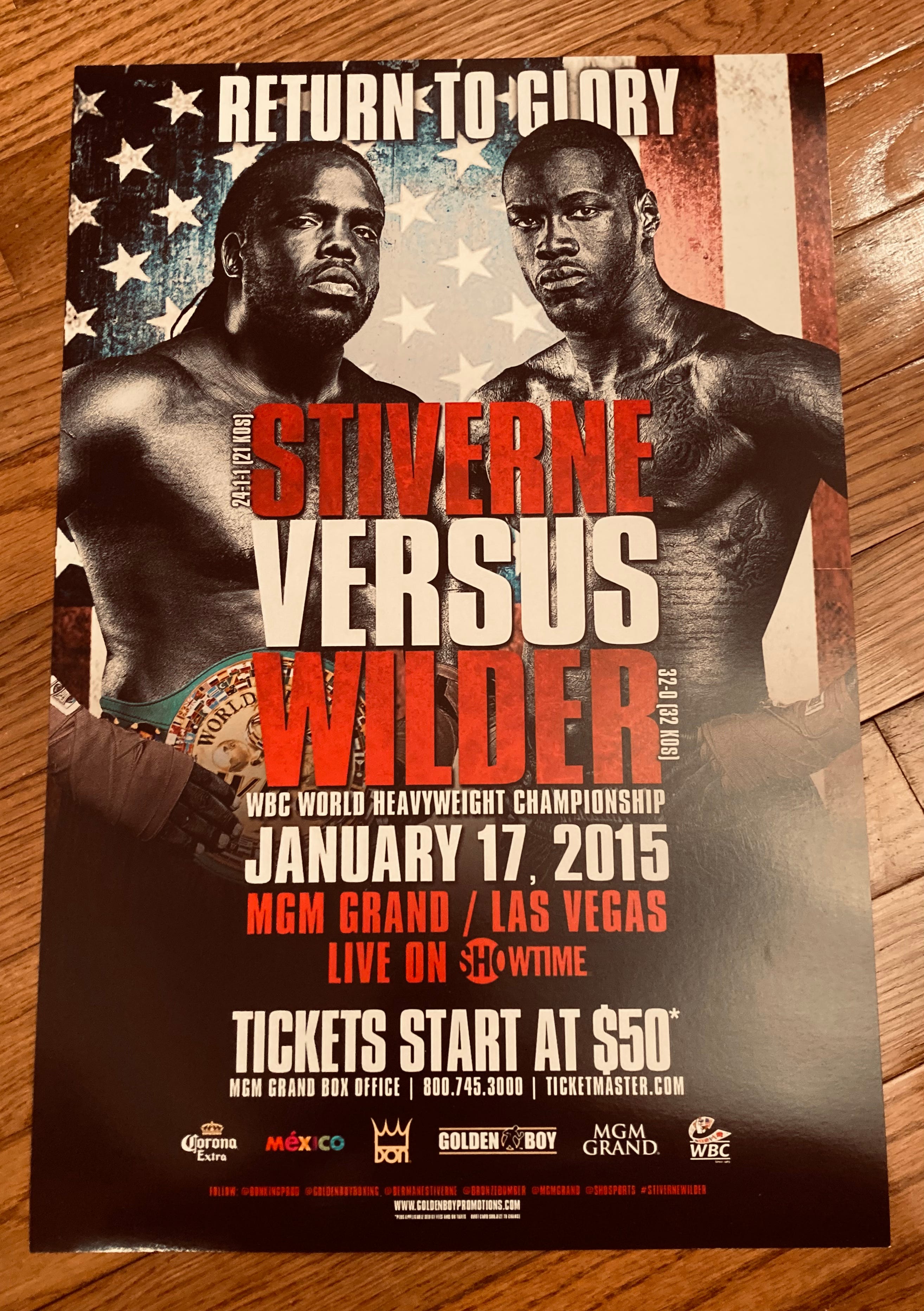 Deontay Wilder was 32-0 with 32 knockouts but had yet to face a serious opponent when he stepped into the ring as the mandatory challenger for then-WBC heavyweight titleholder Bermane Stiverne, a hard puncher who had knocked out perennial contender Chris Arreola on the sixth round of their rematch to win the vacant title in his previous fight. There were many questions surrounding Wilder. How would he deal with a bona fide opponent? What about his stamina? Would he be effective if the fight went deep after having knocked out all of his previous opponents inside four rounds? Wilder answered all of the questions against Stiverne. Although he went the distance for the first time, Wilder thoroughly dominated the fight, which I covered at the MGM Grand in Las Vegas. He did not tire and won the title he would hold for a little over five years through 10 successful defenses via scores of 120-107, 119-108 and 118-109. The fight was on Jan. 17, 2015 — seven years ago on Monday. Here is a very scarce thin cardboard site poster in my collection.