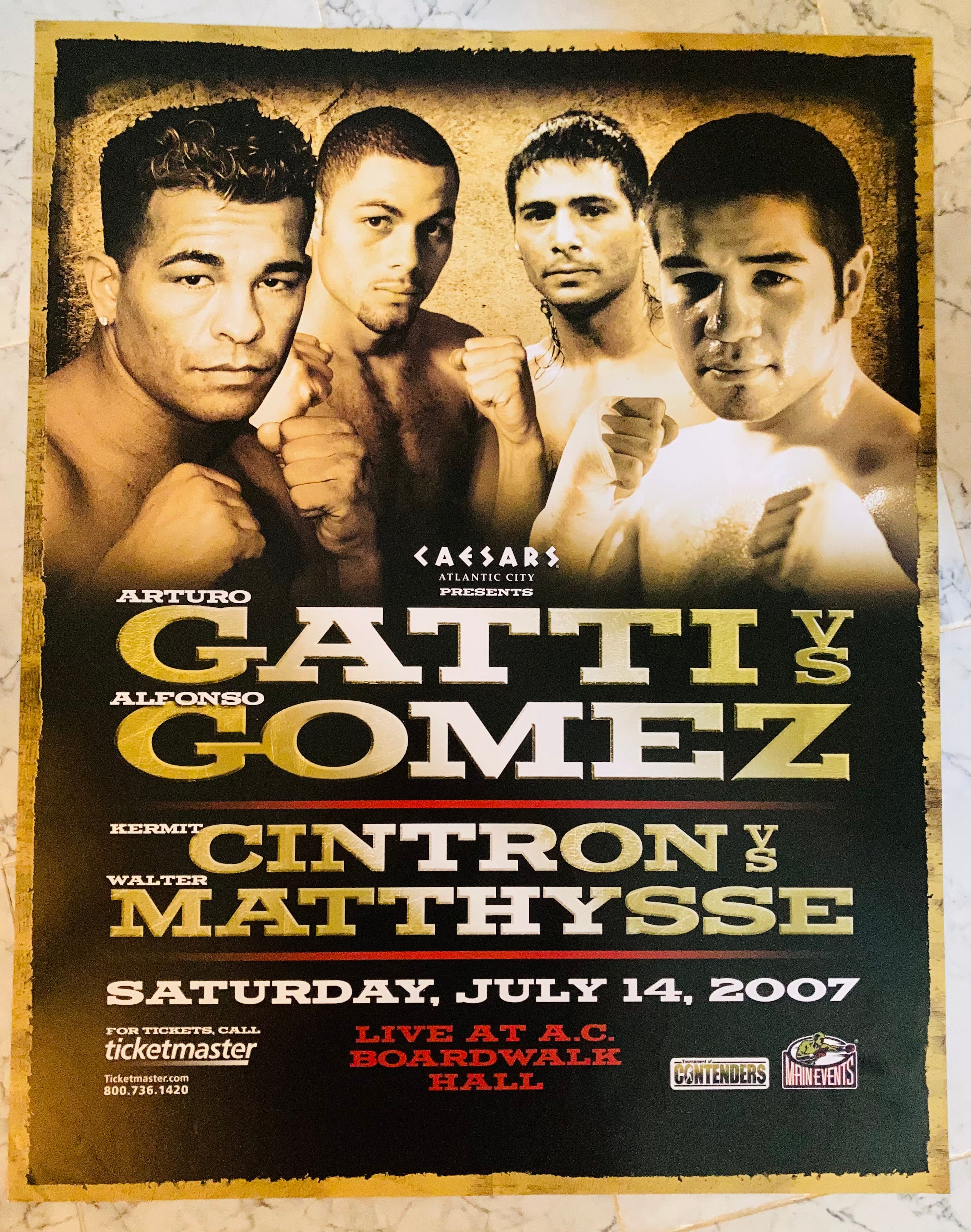 Sadly, Gatti had nothing to offer other than his enormous heart. He took a one-sided beating from Gomez, who stopped Gatti with a big right hand in the seventh round. Gatti went down and was trying to get up — no surprise — as the fight was stopped. It was Gatti’s third knockout loss in four fights and brought the curtain down on a career filled with all-time great fights, two world titles (at junior lightweight and junior welterweight) and resulted in his worthy Hall of Fame election. After the fight, Gatti (40-9, 31 KOs) announced his retirement in his dressing room. The fight, which I covered at ringside, was on July 14, 2007 — 15 years ago on Thursday. Here is a scarce site poster in my collection.