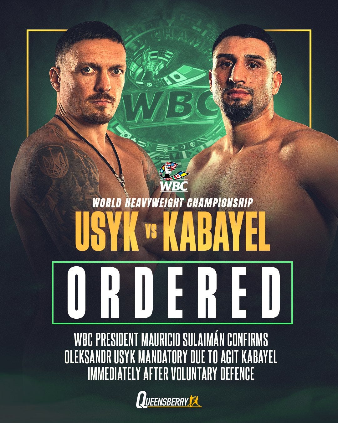 While lineal and three-belt unified heavyweight champion Oleksandr Usyk is permitted an optional defense in his next fight, plans for which are not determined, WBC president Mauricio Sulaiman said after that he will be ordered to face WBC interim titlist Agit Kabayel in a mandatory defense.