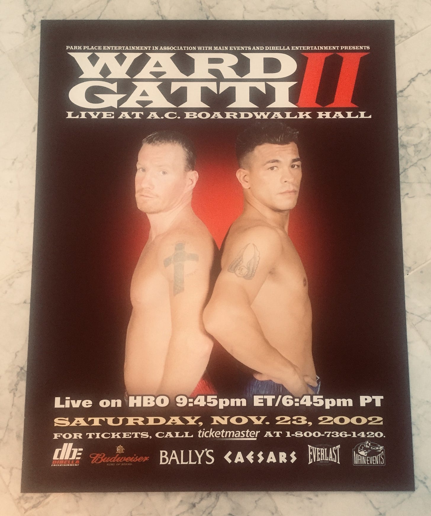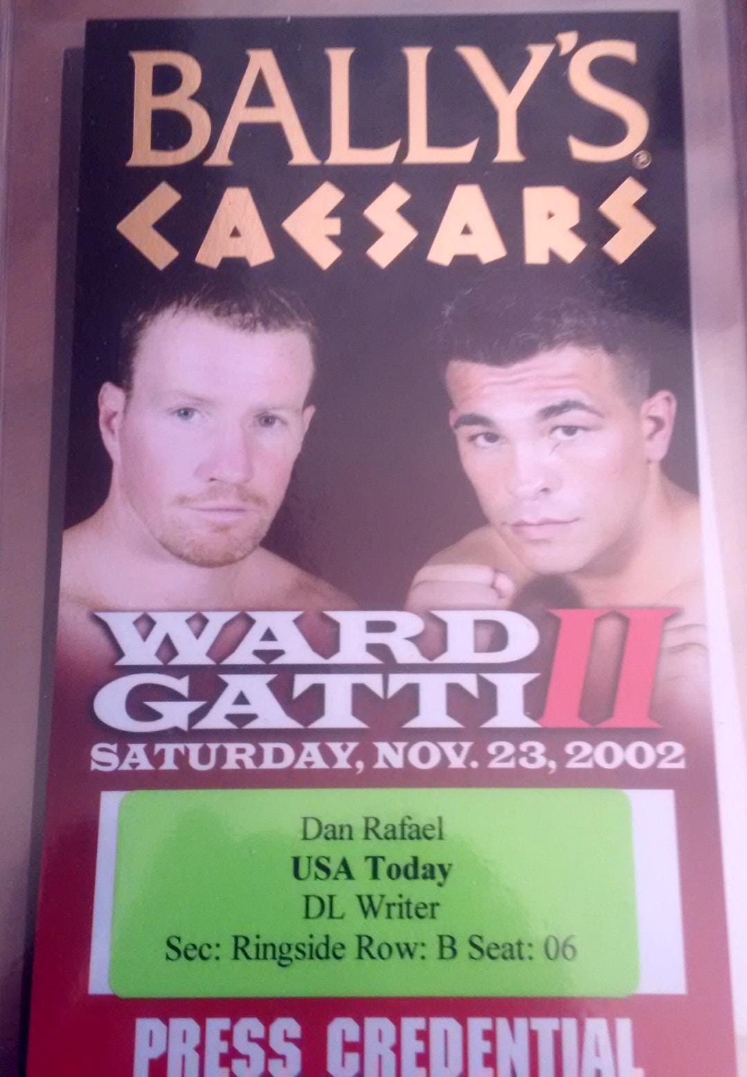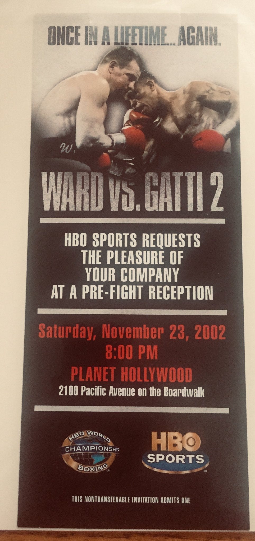 The second fight was also a good one but it was the least exciting of the trilogy — but still pretty damn good. It was also the most lopsided as Gatti dropped Ward in the third round and won 98-91, 98-91 and 98-90 to even the series 1-1. The rematch took place on Nov. 23, 2002 — 20 years ago on Wednesday. Where does the time go? Here is a rare cardboard site poster that was displayed at Caesars Atlantic City during fight week, my ringside media credential and a mint ticket to the HBO pre-fight party in my collection.