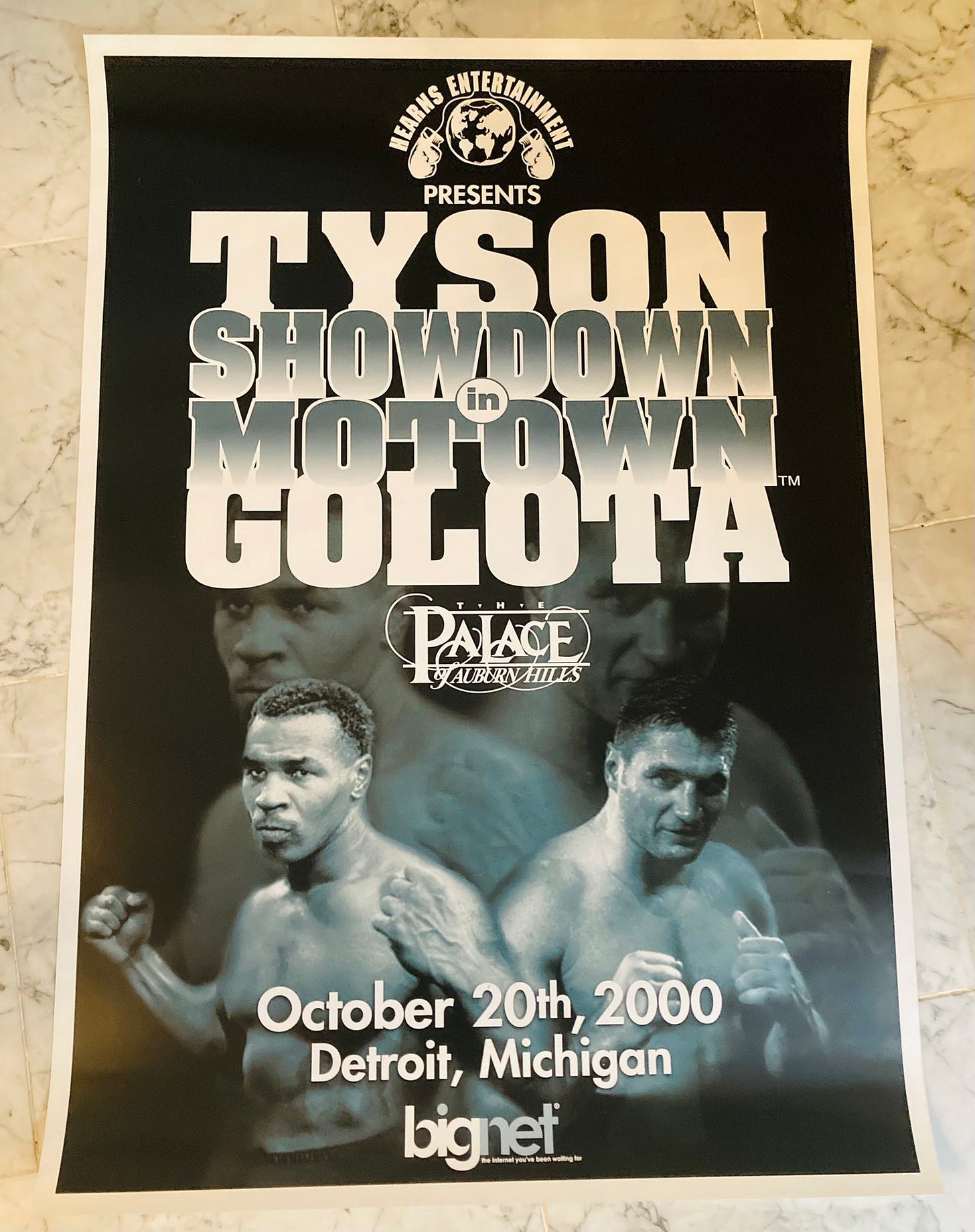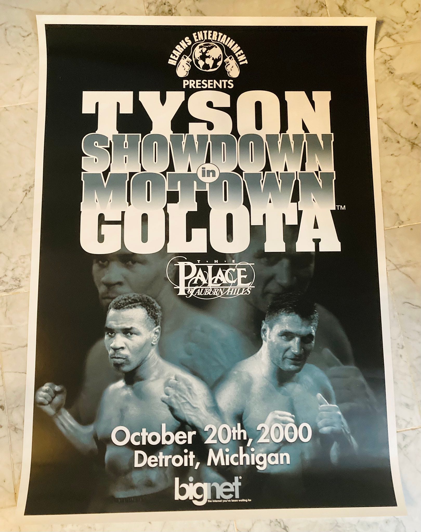The first Mike Tyson fight I covered was his bout with fellow bad boy Andrew Golota at the Palace in Auburn Hills, Michigan. I remember it like yesterday, but not because it was a great fight. Far from it as Tyson dropped Golota in the first round and made him after the second round for a TKO, although the result was later changed to a no contest because Tyson tested positive for marijuana, which was a banned substance. I remember it so vividly because that fight week was the first I met and interviewed Tyson in what was an absolute disaster. I’ve told that story many times, but if you don’t know it click on this sentence. Tyson-Golota was on Oct. 20, 2000 — 21 years ago on Wednesday. The pay-per-view poster is quite common and easy to find, but here is a scarce site poster in my collection.