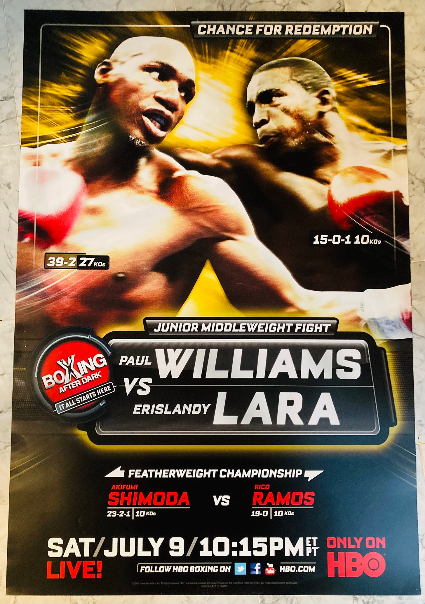 Williams, a once-dynamic fighter on everyone’s pound-for-pound list, looked dreadful as Lara landed straight left hands almost at will and busted Williams up in a pretty one-sided fight, or so most of us thought. The late HBO unofficial scorer Harold Lederman had it 117-111 for Lara. I scored it 116-112 for Lara and was unable to find a single ringside media member who didn’t also have Lara winning. However, our scores don’t count, so it was bad enough judge Al Bennett scored it 114-114. But judges Hilton Whitaker (115-114) and Don Givens (116-114) absurdly both had it for Williams. The pro-Williams crowd booed the scores, which were all terrible. It was as egregious a decision as I have seen and so bad that New Jersey State Athletic Control Board suspended the three judges indefinitely in a virtually unprecedented move and launched an investigation (though they found nothing untoward). Williams would fight just once more, a win, before he was paralyzed in a motorcycle accident soon after he had landed a fight with the then up-and-coming Canelo Alvarez. Lara, of course, would win a world title, spend the next decade as one of the top junior middleweights in the world and later claim a middleweight belt. Williams-Lara was on July 9, 2011 — 13 years ago on Tuesday. Here is a very limited HBO poster in my collection.