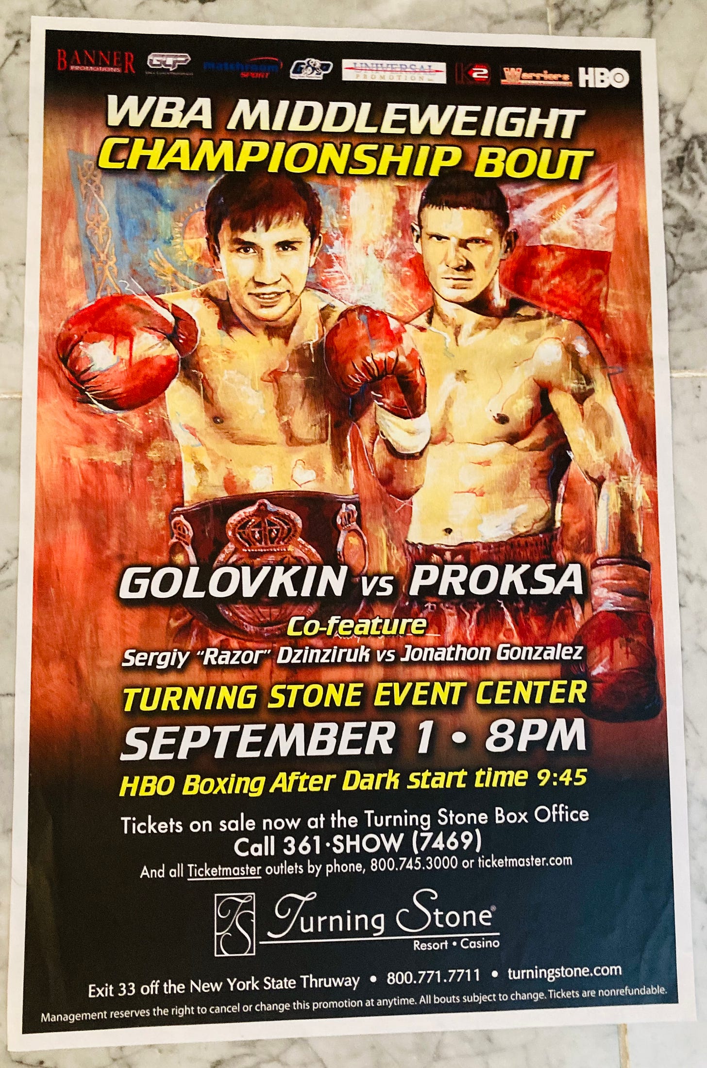 It was extraordinarily impressive to watch GGG violently dismantle Proksa with three knockdowns in a one-sided fifth-round knockout at Turning Stone Resort Casino in Verona, New York. That’s the fight that began his rise to stardom. I was fortunate to have covered 16 of GGG’s fights at ringside, including in England, but I unfortunately was not at his destruction of Proksa, which kick-started the GGG legend. That memorable performance fight took place on Sept. 1, 2012 — 13 years ago Monday. Here is a site poster in my collection.