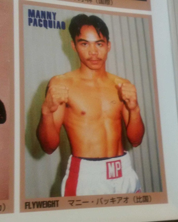 Here is Pacquiao’s scarce rookie card in my collection. It is part of a panel of four cards on thin card stock that was inside the February 1999 issue of the monthly Japanese “World Boxing” magazine and meant to be cut out. Mine is still part of the complete panel and attached to the issue. From 1996 to 1999 each issue contained a four-card panel. The set consists of 45 panels and 180 cards. Each panel typically featured two Japanese boxers, a retired legend and one active non-Japanese boxer. The set is tremendous and filled with stars of the time and retired legends. Besides Pacquiao, the set includes cards of fighters such as Muhammad Ali, Joe Frazier, Joe Louis, Sugar Ray Robinson, Salvador Sanchez, Ricardo Lopez, Lennox Lewis, Oscar De La Hoya, Felix Trinidad, Bernard Hopkins, Erik Morales, Kostya Tszyu, Johnny Tapia and many more. The Pacquiao rookie is by far and away the key card in the set.