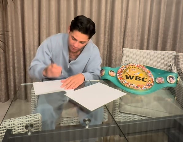 “It’s been a long day but I promised you guys I would have this video for you — my next fight announcement,” Garcia said as he sat down at a table with a WBC belt next to him, presumably the interim lightweight strap he briefly held in 2021. “Here’s the contract like I promised you guys. … Boom, here I go. Signed. I am going to be fighting for the real WBC championship belt against Mario Barrios, Feb. 21. Get ready, cause I’m coming.”