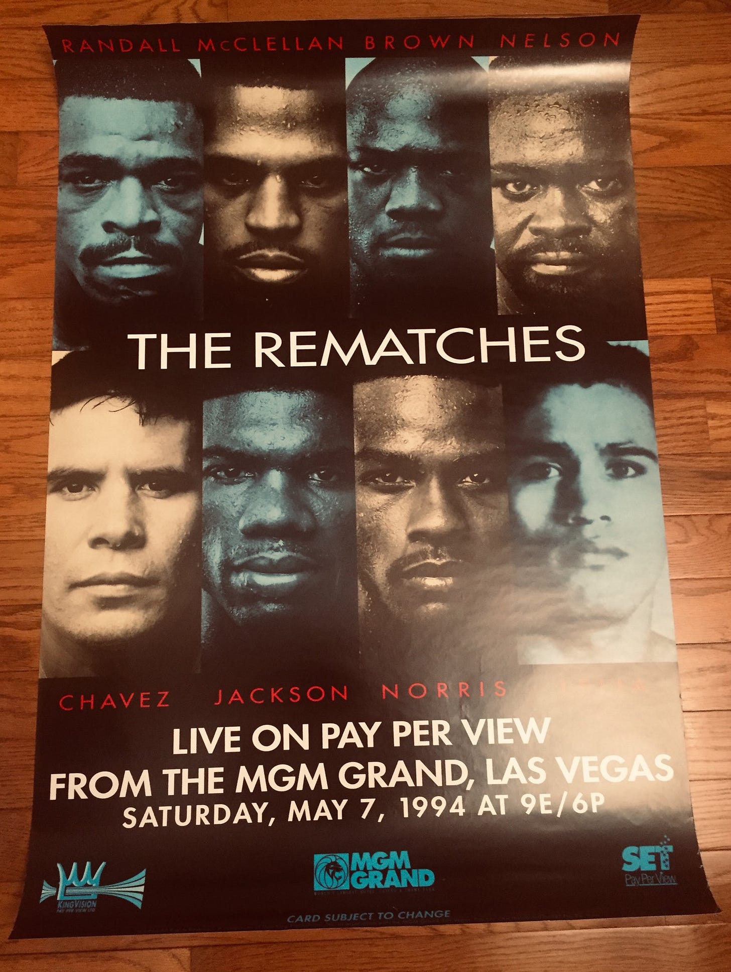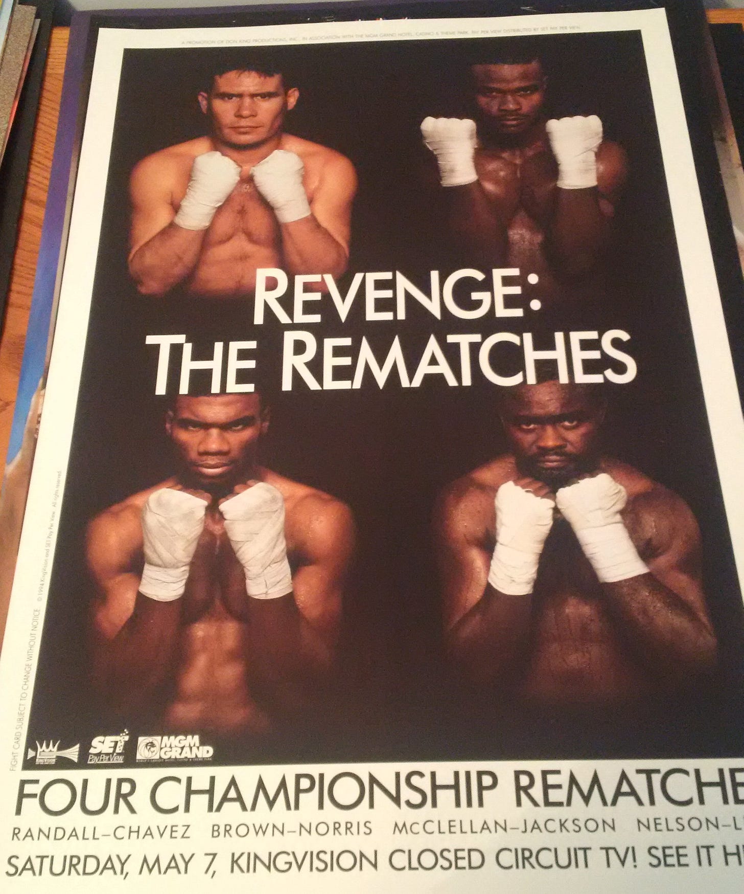 The May 7, 1994 event at the MGM Grand Garden Arena in Las Vegas was absolutely tremendous from top to bottom and featured four highly significant world title rematches. In the main event, the legendary Julio Cesar Chavez controversially avenged his first defeat after beginning his career 89-0-1 with an eighth-round technical decision over Frankie Randall to reclaim the WBC junior welterweight title. Also on the card: Gerald McClellan knocked out Hall of Famer Julian Jackson in the first round to win the WBC middleweight title after having knocked him out in the fifth round of their first fight; HOFer Terry Norris outpointed Simon Brown to avenge a fourth-round knockout loss and regain the WBC junior middleweight title; and James Leija dropped and outpointed HOFer Azumah Nelson to win the WBC junior lightweight title after they had previously fought to a draw. The card also featured another HOFer, Ricardo Lopez, outpointing Kermin Guardia to retain the WBC strawweight title. Here are two posters from the event — the pay-per-view and closed circuit versions, — in my collection.