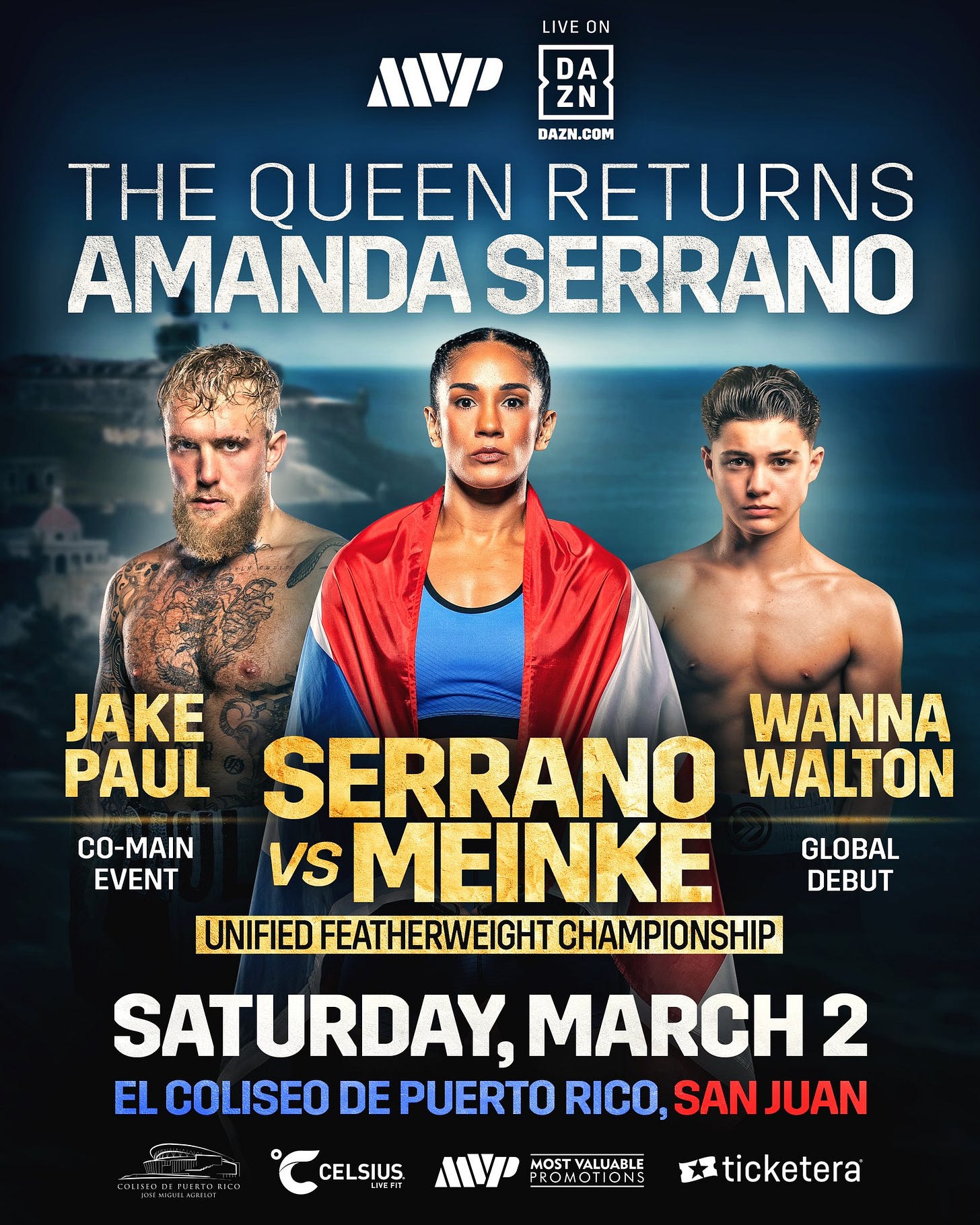 Unified women’s featherweight champion Amanda Serrano will make a Puerto Rican homecoming defense in the main event of a March 2 card (DAZN) at the Coliseo de Puerto Rico in San Juan with her more famous promoter, cruiserweight Jake Paul, stepping back from the spotlight to the co-feature, Paul’s Most Valuable Promotions announced.