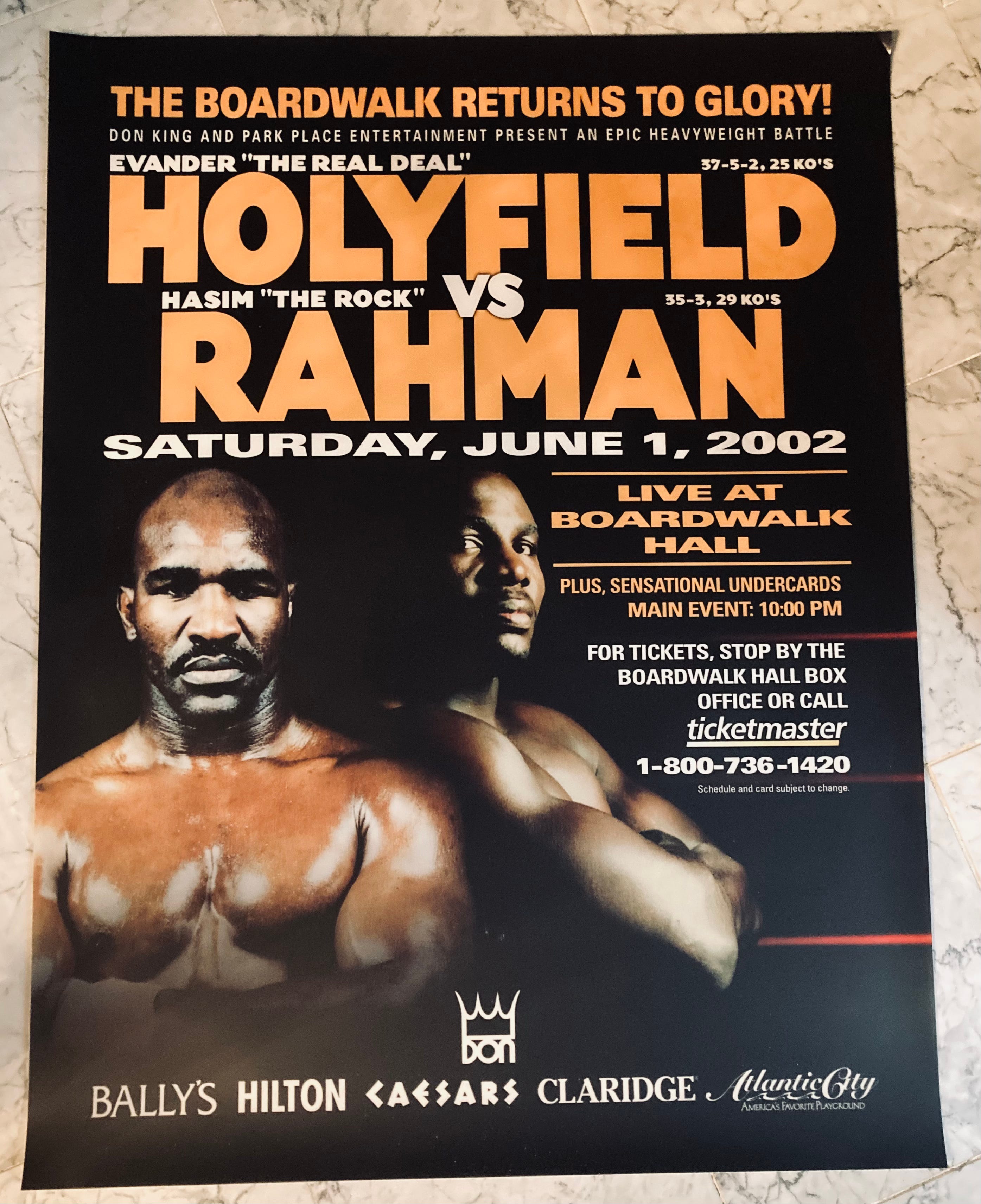 Holyfield generally outboxed Rahman, but the key moment was an accidental head butt during the seventh round that left Rahman with a massive and grotesque hematoma over his left eye. It literally looked like he had another head growing out of his head. The swelling was so severe that the fight was stopped midway through the eighth round and sent to the scorecards for a technical decision. Holyfield won the split decision with two judges scoring it 69-64 and one judge giving it to Rahman 67-66. While Holyfield would fight for nearly another decade the victory over Rahman was the last big win of his career. The fight was on June 1, 2002 — 20 years ago on Wednesday. Here is a tremendously rare site poster in my collection that originally hung in a light box on the famed Atlantic City boardwalk during fight week.